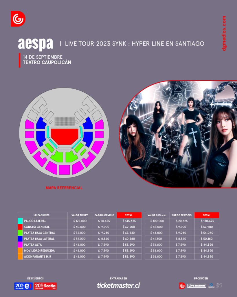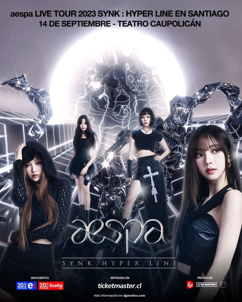 Tras el lanzamiento de su tercer Mini Álbum «MY WORLD» a través de Warner Records, el grupo de chicas K-Pop aespa ha anunciado hoy su primera gira mundial, «aespa LIVE TOUR 2023 ‘SYNK : HYPER LINE’», con paradas en Estados Unidos, Latinoamérica y Europa. Para el 14 de septiembre será la cita con Chile en Teatro Caupolicán.