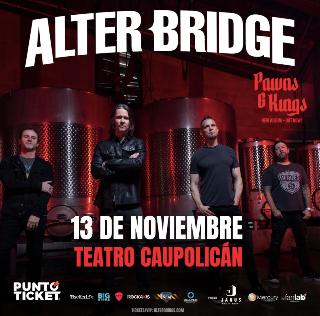 Alter Bridge, se presentará en el Teatro Caupolicán el próximo 13 de noviembre, y las entradas, disponibles en Puntoticket desde el 30 de agosto, tienen un valor de: Palco $70.000, Cancha $49.000 y Platea $44.000, más cargos por servicio.