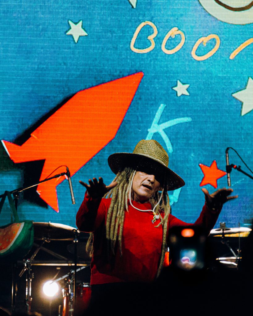 La mítica tabla de shortboard del músico, artista y compositor argentino se desplegó mientras sonaba el himno de Fun People, “Bad influence”, el cual fue el caldo de cultivo perfecto para que comenzaran a alzarse a viva voz las primeras consignas políticas del espectáculo en contra del fascismo, la guerra, el maltrato animal y el controversial Registro Único de Vándalos anunciado por el actual presidente de nuestro país.