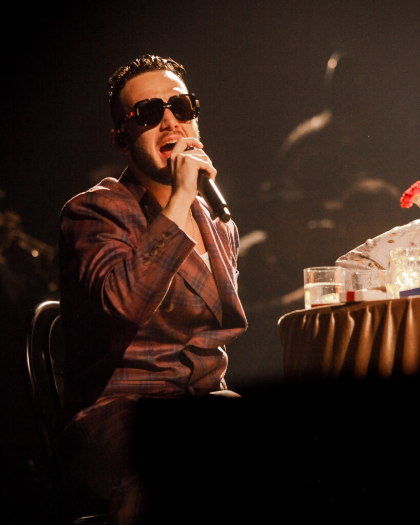 Nos atrapa la teatralidad de la puesta en escena y la dirección audiovisual, los colores y las formas evocan un clásico de Almodóvar y los ritmos y letras convierten a C. Tangana en una especie de García Lorca de esta era. Luego de una pausa damos inicio al segundo acto, esta vez una amplia mesa al centro del escenario nos transporta a lo que fue su destacada sesión Tiny Desk en 2021. Aproximadamente 20 músicos alrededor de esta mesa como en una ceremonia popular que inicia con «Me maten». Entre palmas, meneos y gritos típicos de la canción española, destaca en la multitud la figura de La Húngara, coqueta e iluminada eleva la presentación y se luce con su «Mala, malita, mala». Continúan sentados cuando identificamos los primeros sonidos de «Ingobernable», otro de sus éxitos más populares, imposible quedarse inmóvil ante este ritmo de bulería pop que provoca aplaudir y mover los pies. “Es el último, parecía imposible pero llegó el día. Brindo por ellos que hacen posible todo esto, me van a hacer llorar… increíbles músicos, muchos, muy guapos y muy buenos, gracias por hacer los sueños realidad, ¿verdad Sonia? voy a cantar mi canción favorita” agregó, mientras nos preparamos para lo que fue el clímax de esta obra, el momento más catártico de la noche al ritmo de «Sabor a mí» en una versión sinfónica con predominancia de voces, que junto a una base electrónica son la combinación perfecta que solo C. Tangana puede lograr. Termina este clásico de la balada en español con la escena de dos de sus músicos besándose en uno de los momentos más cinematográficos de la noche. Gritamos, secamos nuestras lágrimas y seguimos con este sufrimiento bonito al ritmo de «Los tontos» en una versión electrónica que se mezcla con un clásico del synth pop «Bizarre love triangle» de New Order para finalizar este desgarrador segundo acto.