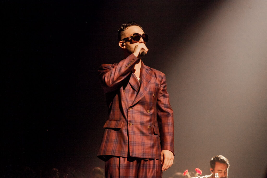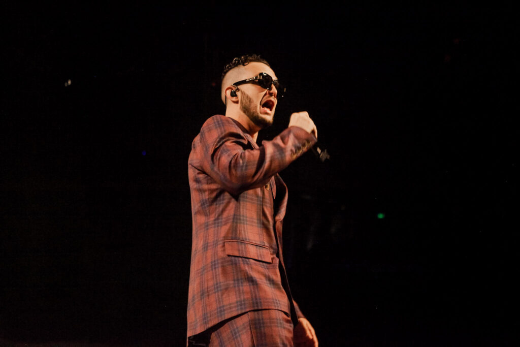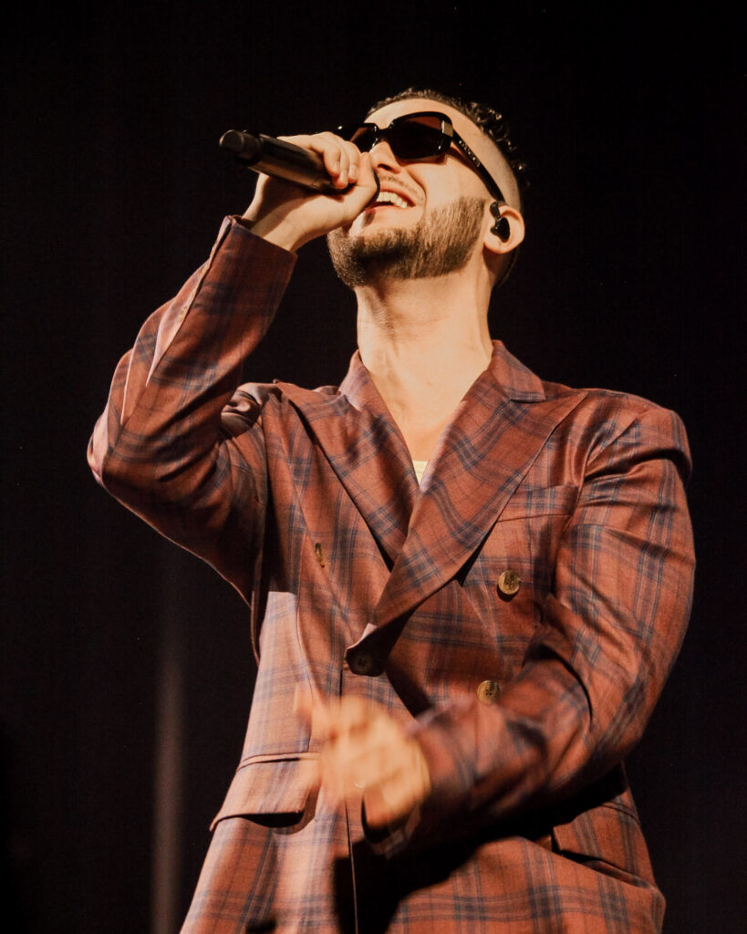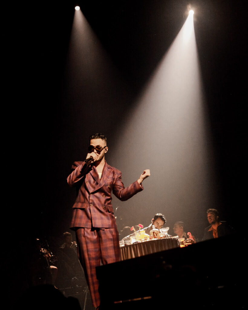 Sabíamos que esta versión extensa de «Sin cantar ni afinar tour» venía cargada de dramatismo y bohemia, pero no estábamos preparados para vivirlo. Son pasadas las 21:00 horas y la oscuridad nos indica que todo comienza, una pantalla gigante al centro nos hace sentir que el Movistar Arena es un cine y que la película que tanto esperamos comienza con la aparición de los músicos y coristas, cada quien con un rol que interpretar en esta obra dramática que podemos dividir en 3 actos, como los clásicos de la literatura. Vestido con un traje escocés, sudadera blanca, mocasines y lentes de sol, El Madrileño aparece desde un costado del escenario. Esta primera parte, que definiremos como Acto 1, comienza con «Still Rapping», la orquesta con una propuesta sinfónica que poco a poco se mezcla con los sonidos sucios de este trap. Este primer acto se caracteriza por los sonidos más urbanos y las letras más insinuantes de su repertorio, lo sentimos al escuchar «Comerte entera» y «Ateo», esta última en una sensual performance con una de sus coristas en la voz de Nathy Peluso. El escenario se enciende y el calor del recinto se empieza a sentir en los cuerpos de todos, no hay tregua ni palabras mientras escuchamos «Párteme la cara» y «Nominao». En este punto, las primera palabras de la noche “si alguien me hubiera dicho que estaría cantando frente a 14 mil personas, habría dicho que estaba mal. Pa’ mi esto es un sueño. Gracias por venir” expresó para continuar con uno de sus más grandes éxitos, «Demasiadas Mujeres» en introducción musical de impacto y una voz increíble, cerramos este primer acto.