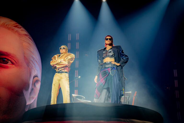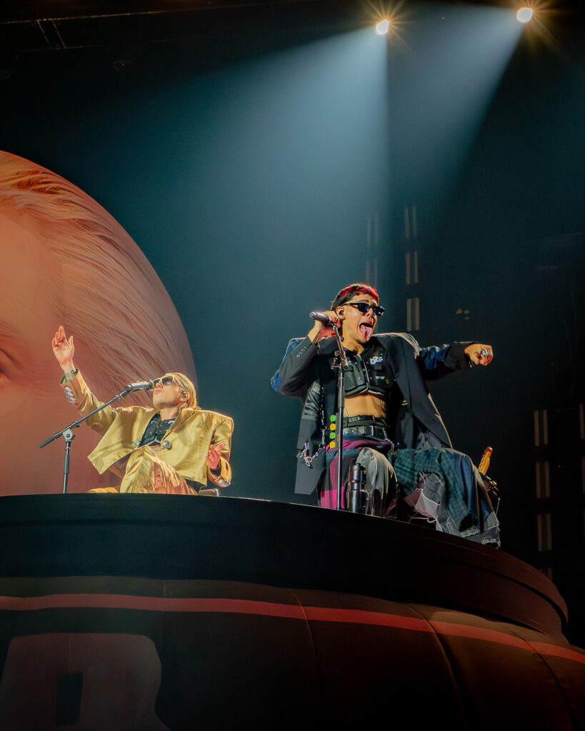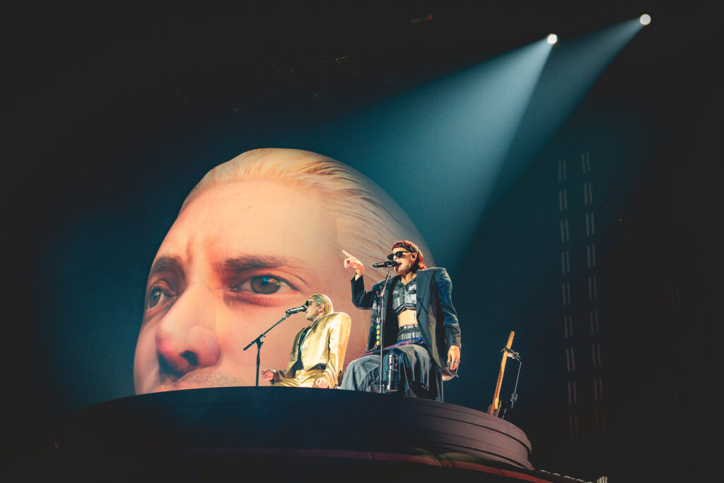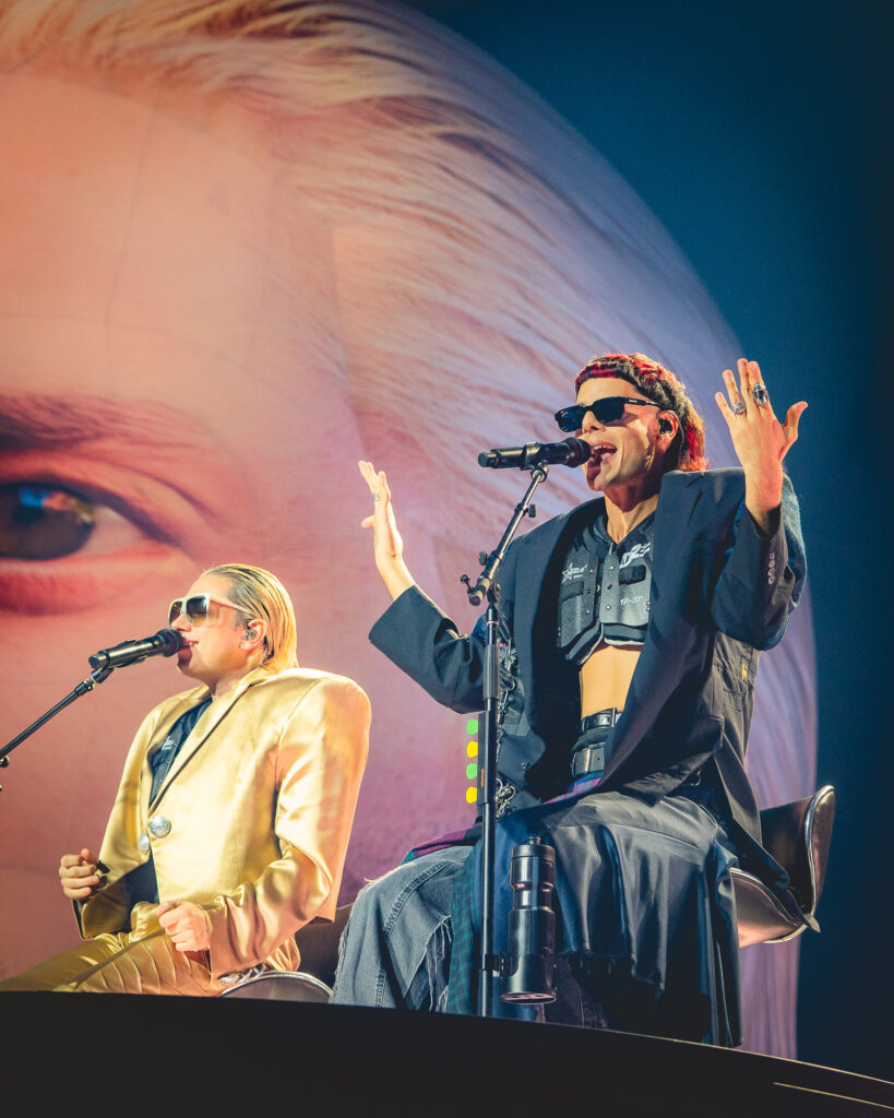 Luego en el turno de “Impostor”, se vivió una dinámica diferente. Y es que un camarógrafo se subió a la plataforma -donde aún permanecía el dúo- e interactuó con ellos desde muy cerca, dando un toque más cinematográfico al show, con cada uno de ellos cantando pegado a la cámara, lo que se iba proyectando en las grandes pantallas de los costados del escenario.