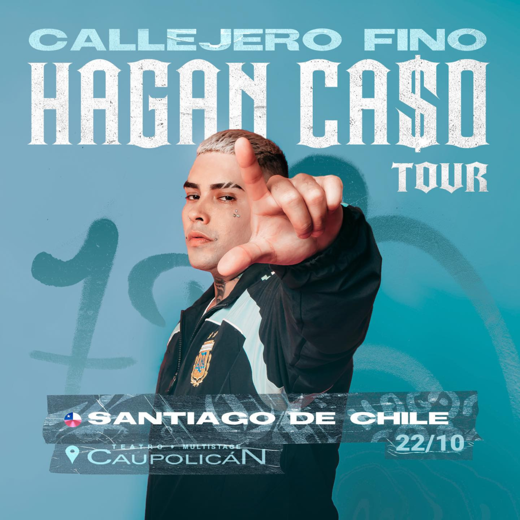 El fenómeno de la música trasandina, Callejero Fino, llegará a Santiago para ofrecer un imperdible concierto, el 22 de octubre en el Teatro Caupolicán. Este show, ampliamente esperado por sus fanáticos nacionales se enmarca en su ‘Hagan Ca$o Tour’ y contará con todos los hits que se han convertido en virales. Entradas disponibles en PuntoTicket.