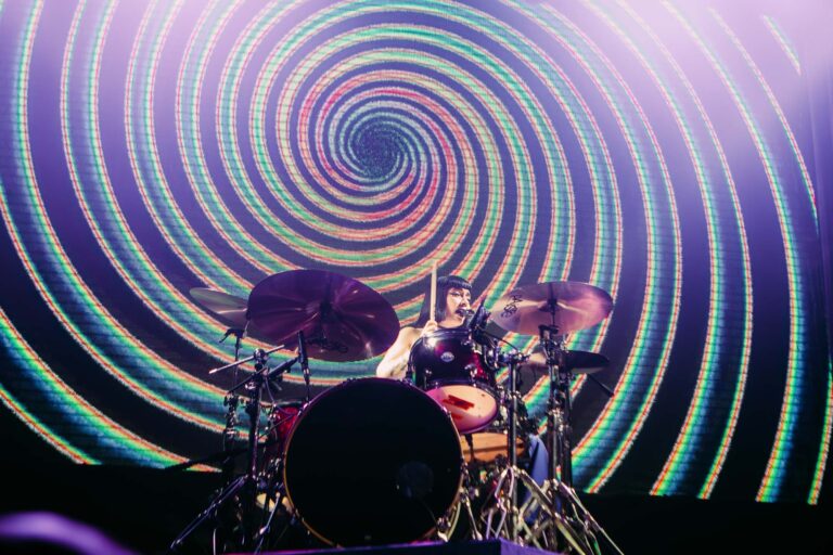 El río musical sigue fluyendo mientras la silueta y la cabellera de Cancamusa bailan entre el humo y el arcoíris terracota de “En medio del desierto” nos baña. Casi sin respiro, Gepe es parte de la fiesta y las esferas sonoras giran y giran mientras nuestros pies y cuerpos se mueven al ritmo de “Dopamina”. Somos parte de la celebración de una vida mágica, ay, sí, tocando y tocando sin parar.