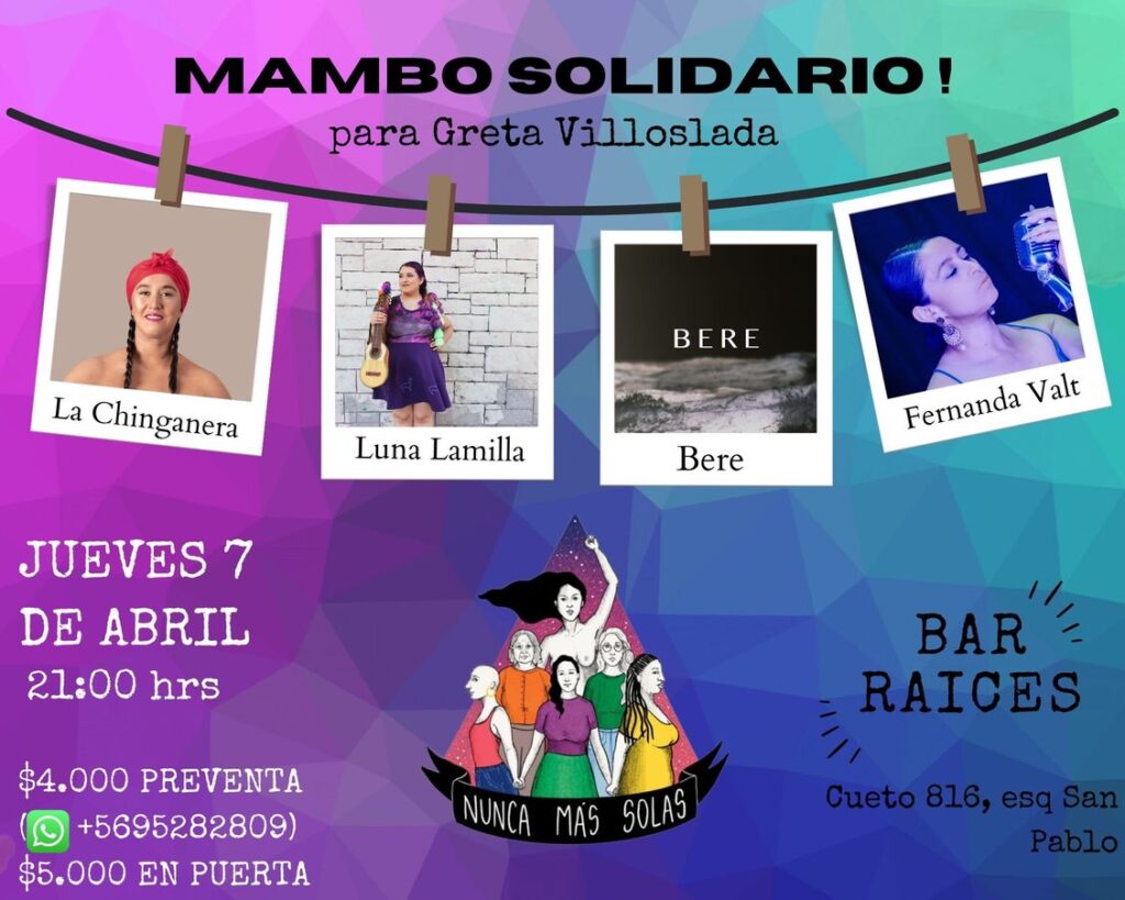 El evento se realizará este jueves 07 de abril en el Bar Raíces (Cueto 816, esquina San Pablo, Santiago Centro), desde las 21 horas. Y contará con las cantautoras y músicas chilenas La Chinganera, Luna Lamilla, Fernanda Valt y la banda Bere. Las entradas en modo preventa tienen un valor de $4.000 a través del wsp +5695282809 y $5.000 el mismo día.
