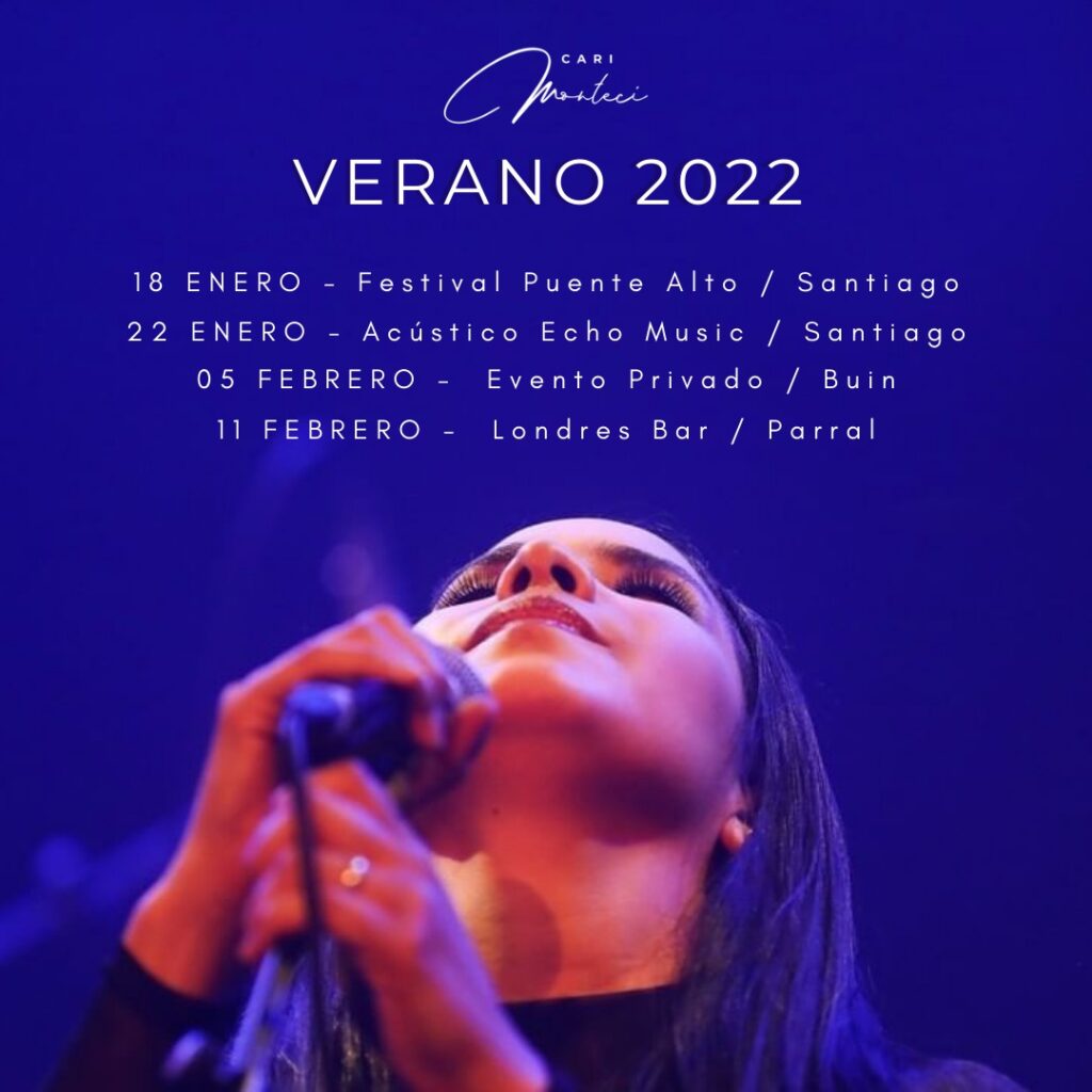 Luego de terminar un año completamente en alto, Cari Monteci sigue encantando al público, esta vez con shows en vivo que realizará durante los meses estivales. En enero, se presentará en el Festival de Puente Alto y realizará un show acústico en Echo Music, mientras que en febrero, estará en Buin y Parral.
