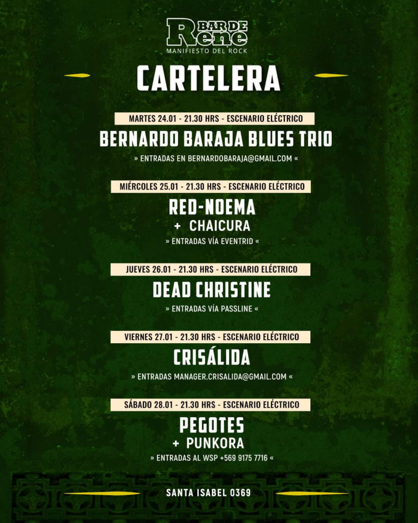 Comienza una nueva semana de música en vivo en Bar de René a cargo de las bandas  «Bernardo Baraja», «Red Noema», «Chaicura», «Dead Christine», «Crisálida», «Punkora» y desde Concepción todo el punk rock de Pegotes.