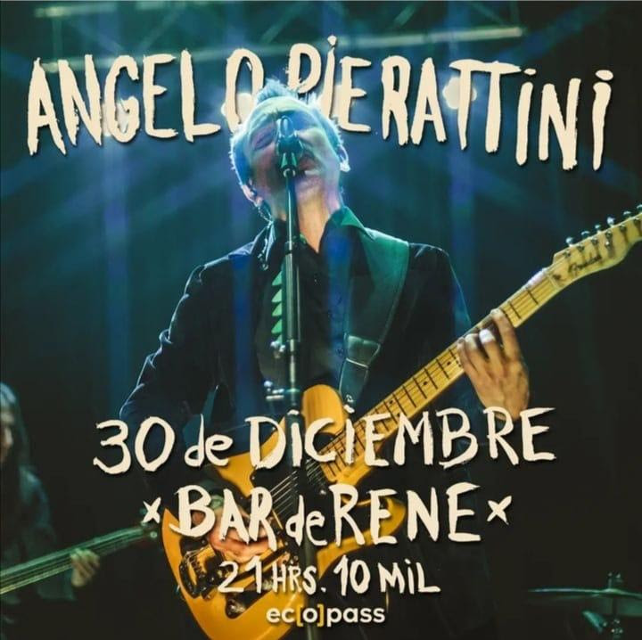 “Angelo Pierattini” Y llega la última fecha del año! el encargado es nada mas ni nada menos que don Angelo Pierattini, vocalista y guitarrista de Weichafe, reconocido solista y líder de diferentes proyectos musicales (Hueso, Las calaveras errantes etc) Una prolífica carrera, de parte de un gran artista que nos sorprende cada año con nuevas entregas. En esta oportunidad a preparado un show larga duración con banda completa que no estará exento de sorpresas y por supuesto, con un recorrido con lo más destacado de su discografía. Realmente un imperdible clásico del bar de todos, los esperamos.