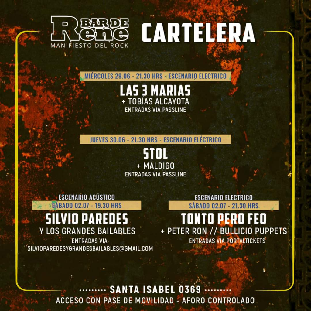 Durante esta semana, sorprende con una variada cartelera nutrida de psicodelia, funk, electrónica y la experimentación de bandas como Tobías Alcayota y Las 3 Marías, el rock de Stol y Maldigo, la electrónica de Silvio Paredes, las bandas rockeras de Tonto Pero Feo, Bullicio Puppets y desde Concepción Peter Ron.
