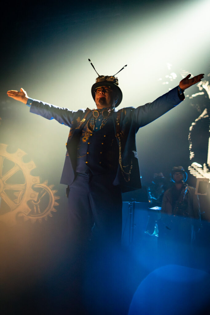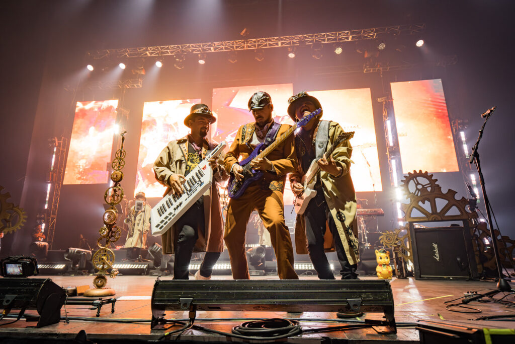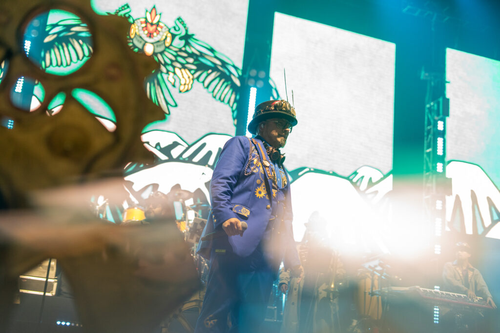 Luego de una intervención corta y estando lejos del planeta Tierra, la sección «Fiesta Espacial» en plena noche fue la odisea hacia la fantasía. Una recopilación majestuosa para bailar hasta que el sudor se secara, pasando con clásicos como «Huevos Revueltos», «Viejo Diablo» y «El Durazno y El Melón». El juego de luces con láser también tuvo mejoras, siendo mayor ambiciosa en su diseño y utilizando cuatro bolas Disco que sus reflejos rodeaba el recinto capitalino, creando un plus a nuestros ojos mientras la música nos hacía trascender al espacio infinito. «Mandinga» fue un claro ejemplo al utilizar láser rojos para adentrarse a su mundo, incluyendo un fragmento de «Thriller» de Michael Jackson cantada en español. «Guach Perry» y «Discojapi» eran infaltables en la mesa, al igual que «Eligiendo una Reina» donde C-Funk -que tuvo presencia más clara en alentar al público y utilizar el pedal talkbox-se dio el lujo de hacer referencia a su banda máter Los Tetas con el riff de «Cha Cha Cha», en un show repleto de estos guiños que era costumbre del cuarteto en su historia. A estas alturas es importante mencionar el aporte de Pancho G en guitarra, Nicolás Letelier en teclados, DJ Humitas en tornamesa, Manuel Torres en percusión y toda la sección de bronces que aguantaron horas y horas de pura energía sin tantas pausas. Así concluía esta aventura de un día completo en todo horizonte.