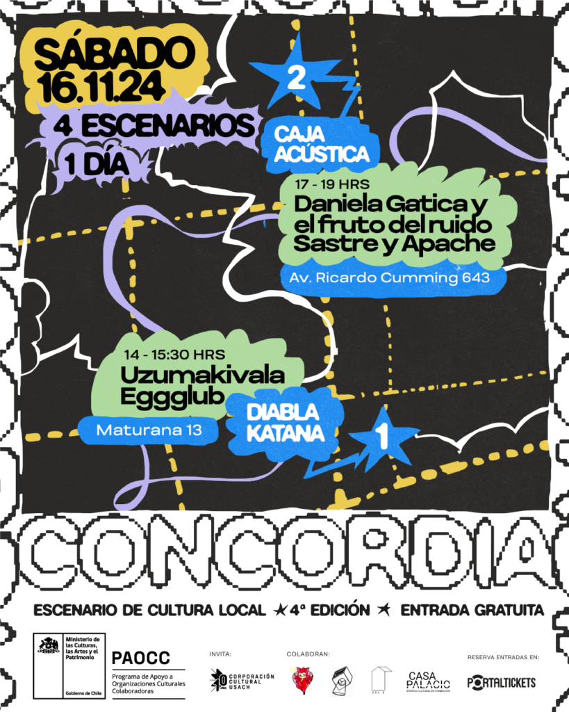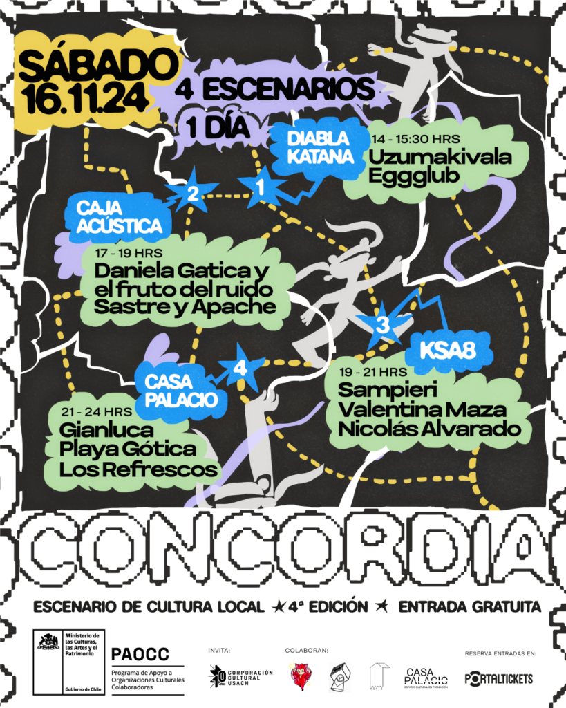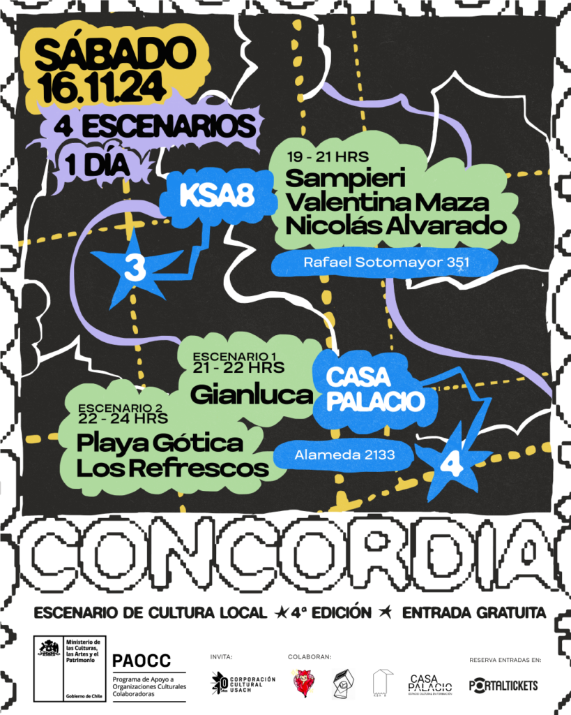 El próximo sábado 16 de noviembre, entre las 14:00 y las 00:00 horas, los barrios Concha y Toro, Brasil y Yungay en Santiago Centro serán parte de una gran fiesta de la música con Concordia: escenario de cultura local, un ciclo musical organizado por la Corporación Cultural USACH que contará con la participación de 10 bandas y/o proyectos muy diferentes entre sí, pero representativos en sus respectivas escenas, los cuales se turnarán para tocar durante toda la tarde y hasta la medianoche, en distintos espacios de estos barrios patrimoniales.