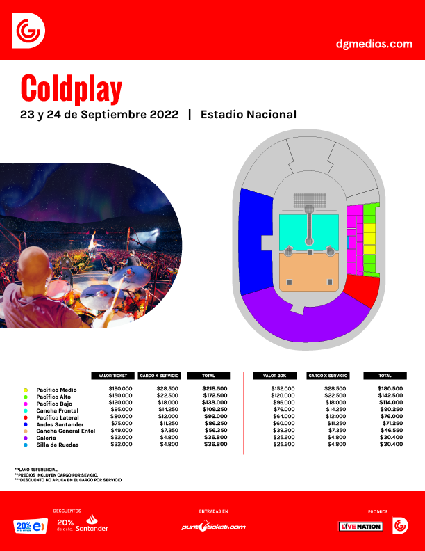 Toda la información sobre tickets la puedes encontrar en www.dgmedios.com, www.puntoticket.com y coldplay.com/tour