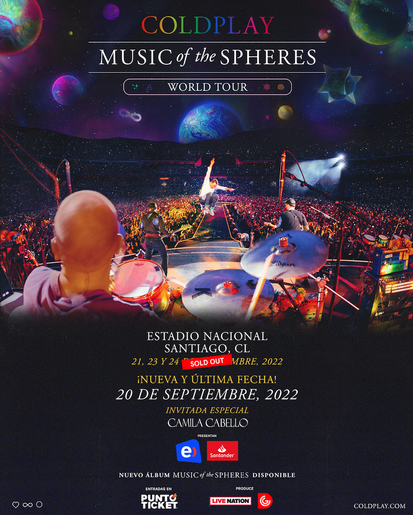 Debido a la abrumadora demanda de tickets, Coldplay anuncia hoy tres nuevos conciertos para su gira mundial Music Of The Spheres World Tour, con fechas en Santiago, Chile Bogotá, Colombia y Buenos Aires, Argentina. La cuarta fecha en el Estadio Nacional de Santiago se confirma para el 20 de septiembre de 2022, convirtiéndose en la primera agrupación en la historia de los conciertos en Chile en confirmar cuatro presentaciones en el recinto de espectáculos y deportivo más importante de nuestro país. Nunca una banda había confirmado 4 presentaciones del mismo tour en el Estadio Nacional y Coldplay lo logra con su Music Of The Spheres World Tour.