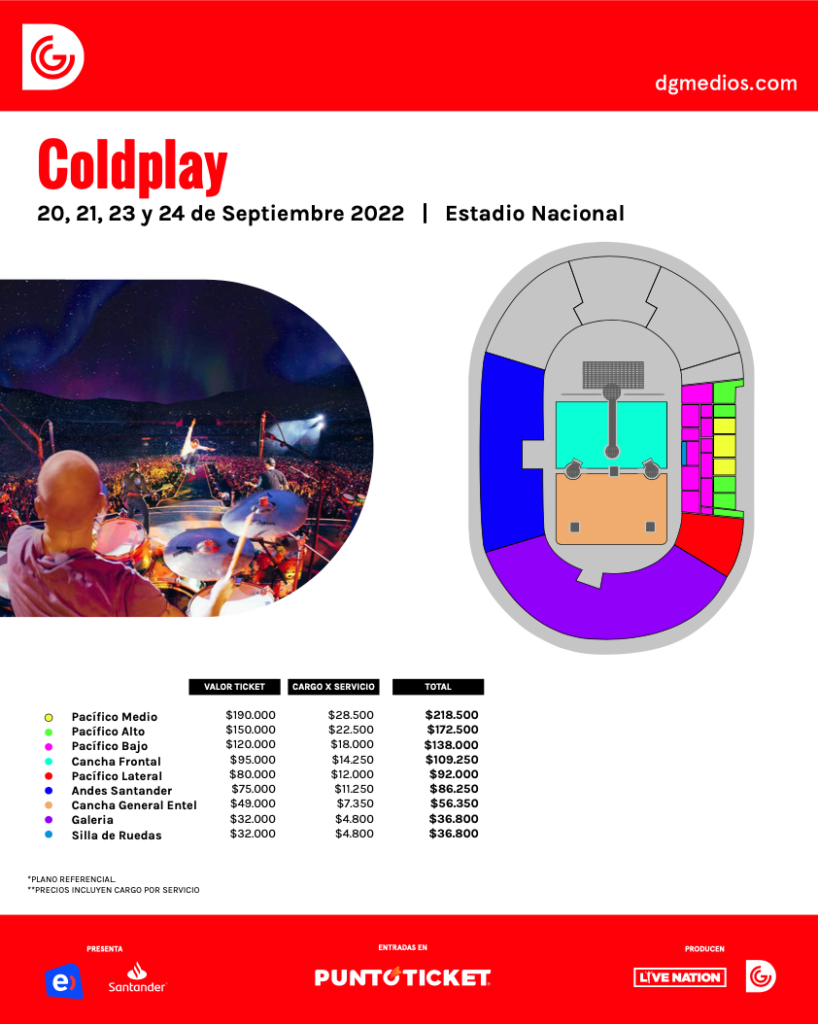 Los tickets para el concierto en Santiago, Chile del 20 de septiembre saldrán en preventa exclusiva para clientes Entel o pagando con Tarjetas Santander el miércoles 25 de mayo a las 11am a través de www.puntoticket.com/coldplay