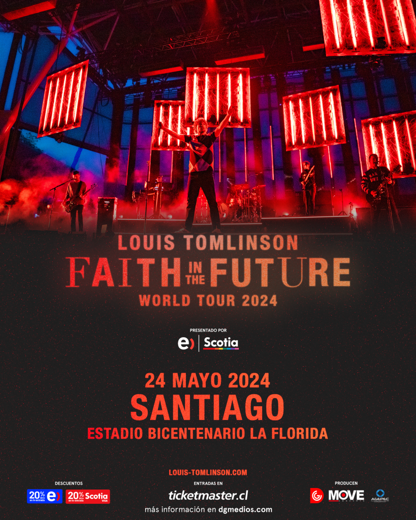 El «FAITH IN THE FUTURE WORLD TOUR» ya ha viajado por Europa y Estados Unidos, cautivando a las multitudes con impresionantes actuaciones y visuales, una experiencia que los fans de Louis Tomlinson no se pueden perder. La última visita de Louis a Chile en 2022 en apoyo del álbum WALLS fue un éxito rotundo, con 3 shows con entradas agotadas. Agrega “Estoy muy emocionado por el resto de la gira y más que orgulloso por el tamaño de alguno de los recintos en los que tengo la suerte de tocar, ¡Va a ser enorme!”.