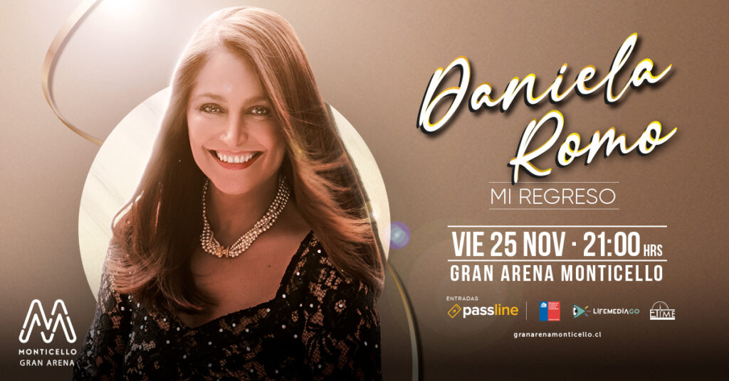 Con un poco más de cinco décadas de trayectoria, una de las más importantes artistas de México, Daniela Romo, confirma su regreso a nuestro país con un show el 25 de noviembre en Gran Arena Monticello. La cantante y actriz, no visita Chile hace más de 20 años, por lo que se reencuentro con su fanaticada local que por años se ha deleitado tanto con su música, como con sus telenovelas.