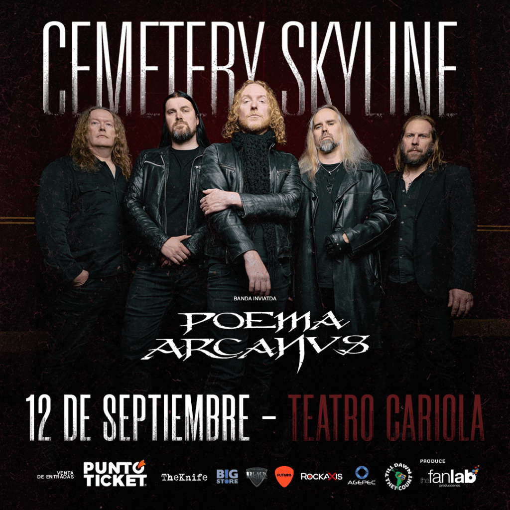 Con el objetivo de dar forma a un proyecto musical sin precedentes inspirado en los grandes referentes del género, nació Cemetery Skyline, súpergrupo que lanzó su primera placa en 2024. Como parte de su Latin American Tour 2025, los célebres músicos debutarán en Chile, el próximo 12 de septiembre, a las 21:00 horas, en el Teatro Cariola. En la apertura del show, se presentará Poema Arcanus, invitado especial en esta cita con el metal de todos los tiempos. Entradas disponibles a partir del día miércoles 28 de mayo a las 11:00 hrs. en PuntoTicket.