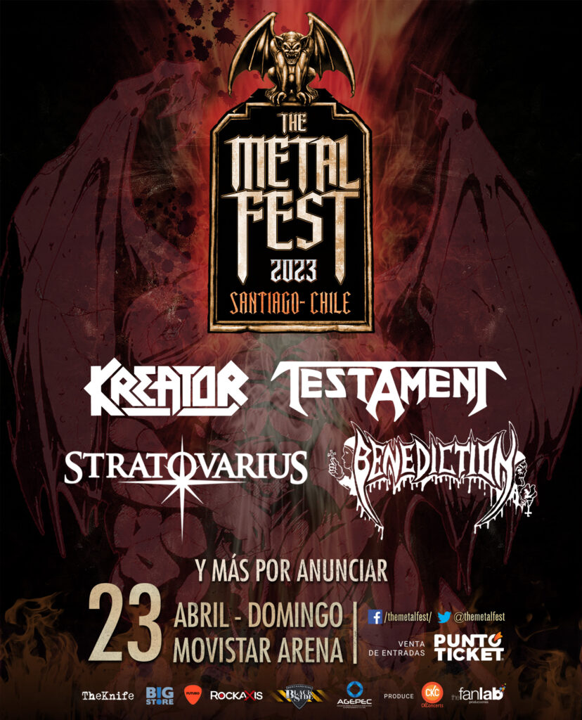 Luego de tres memorables versiones, se confirma un nuevo The Metal Fest, esperado encuentro que reúne a los más connotados exponentes del metal a nivel nacional e internacional. Para esta imperdible jornada, que se realizará el 23 de abril de 2023, en el Movistar Arena, ya están confirmadas las bandas extranjeras Kreator, Testament, Stratovarius y Benediction, nombres que son sólo un avance del line up final. Entradas disponibles desde el 17 de agosto en PuntoTicket.