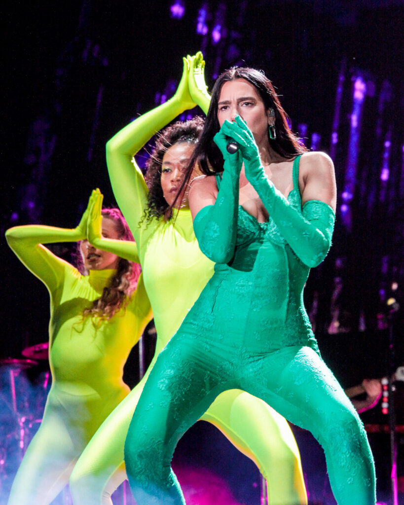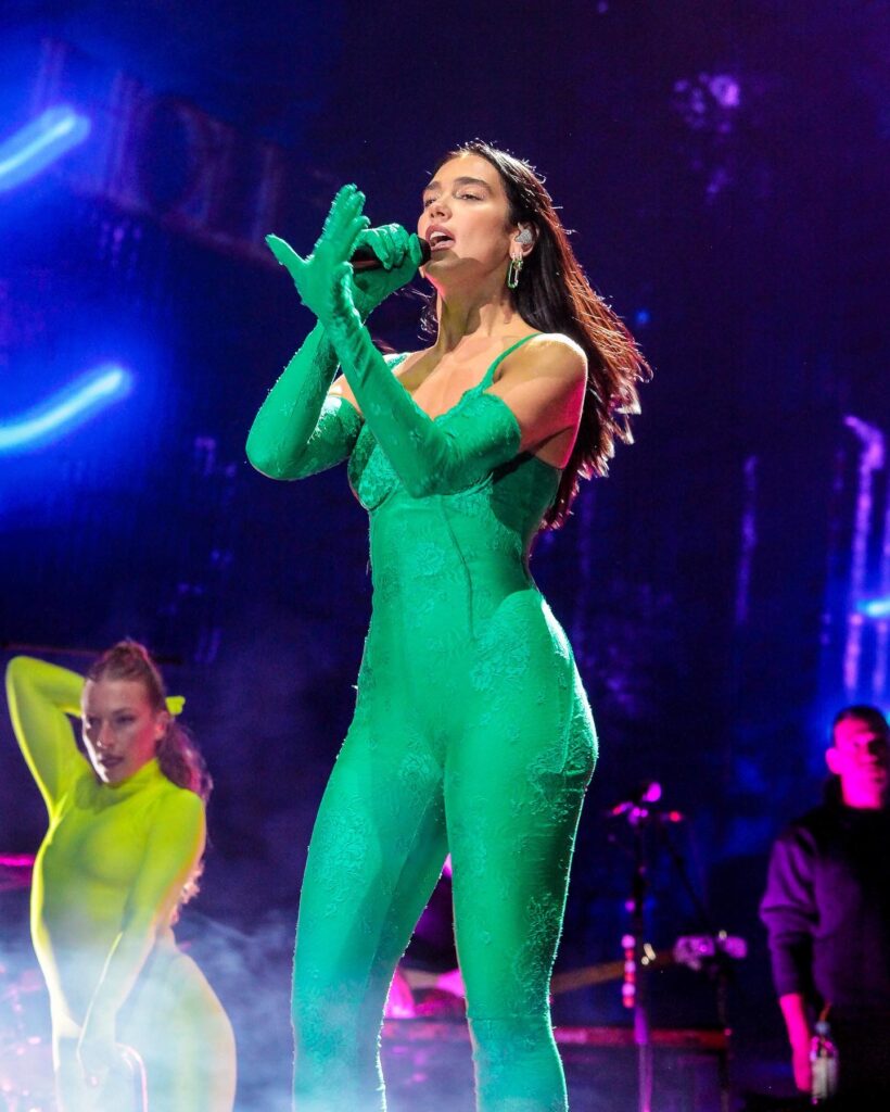 21:02 de la noche y comenzaba la presentación de la cantante británica bajo la introducción en modo retro de toda su compañía en el escenario e invitándonos a su «Future Nostalgia Tour». Vestida completamente de verde junto a su tropa de excelentes bailarines y bailarinas, el recinto capitalino se venía abajo con la interpretación de «Physical», «New Rules» y «Love Again». Canciones elegidas para abrir el show y dejar entrever que la noche se venía a punta de bailes, juego de luces y un sonido muy bien logrado.