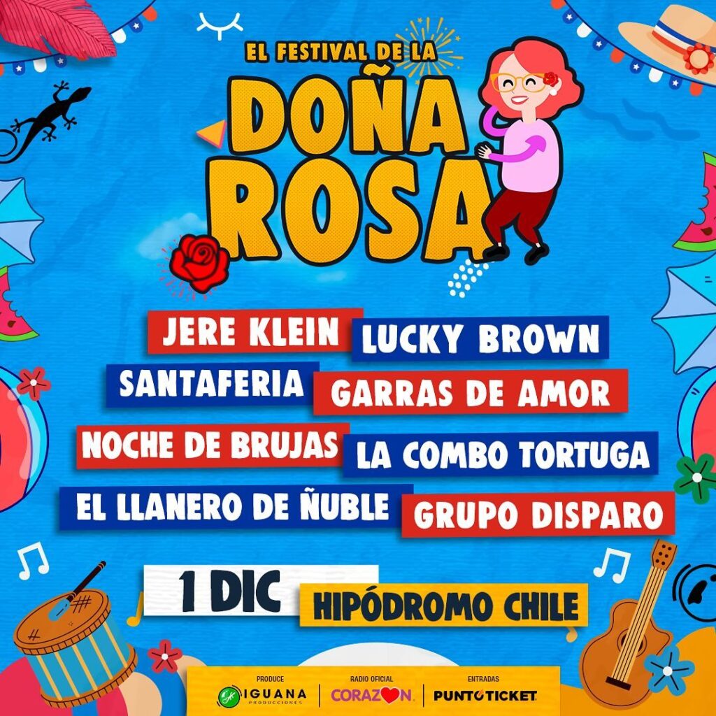 El Festival de la Doña Rosa será el evento que marcará el cierre de año, con la mejor música chilena y una noche llena de sorpresas. ¡No te pierdas esta gran fiesta el 01 de diciembre en el Hipódromo Chile! Compra tus entradas ya a través de Puntoticket y prepárate para disfrutar de una experiencia inolvidable. Produce Iguana.