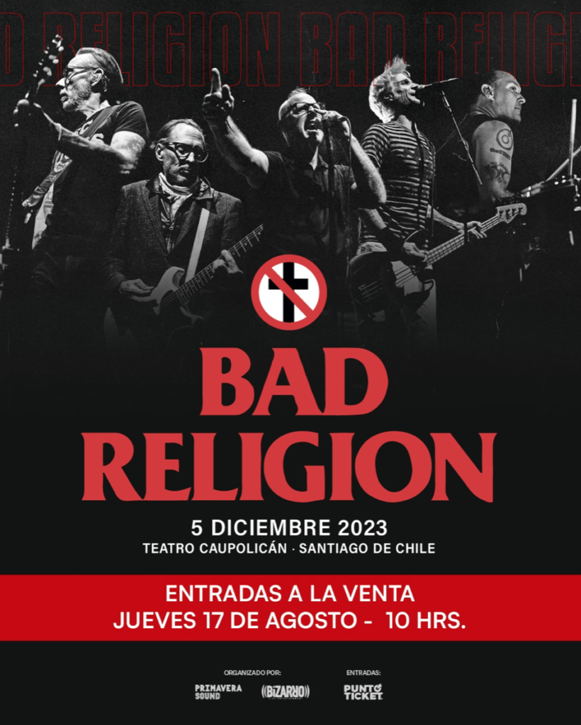 A cuatro años de su última visita a Sudamérica, la banda Bad Religion confirmó su visita a Chile para presentarse esta vez en el Teatro Caupolicán. La cita será el martes 5 de diciembre del presente año, para lo cual los fanáticos de esta leyenda de la música ya se preparan para cantar los éxitos que acompañan la trayectoria de los músicos originarios del sur de California en Estados Unidos. 17 discos de estudio, tres EP’s, tres recopilatorios, dos en vivo y cuatro conciertos en DVD, forman parte del registro de esta agrupación de punk rock fundada en 1980 y que hasta la fecha mantiene vigente su potente y crudo sonido. “Suffer” (1988) fue su tercer álbum, el que es reconocido por los especialistas como el disco de punk rock más relevante de todos los tiempos logrando desde ese momento ganarse el respeto del mundo de la música en general y del rock en particular El disco de 1993 “Recipe for Hate” les aseguró el puesto 14ª en la lista Heatseekers de la revista Billboard de ese año. Pero su mejor momento llegó con “Stranger tan Fiction” (1994) sin duda la placa que los hizo conseguir el deseado disco de oro en los Estados Unidos, posicionándolos con singles como “21st Century (Digital Boy)” e “Infected”. Este trabajo contó además con la colaboración de Eddie Veder, vocalista de Pearl Jam en el sencillo “Whatch It Die”.