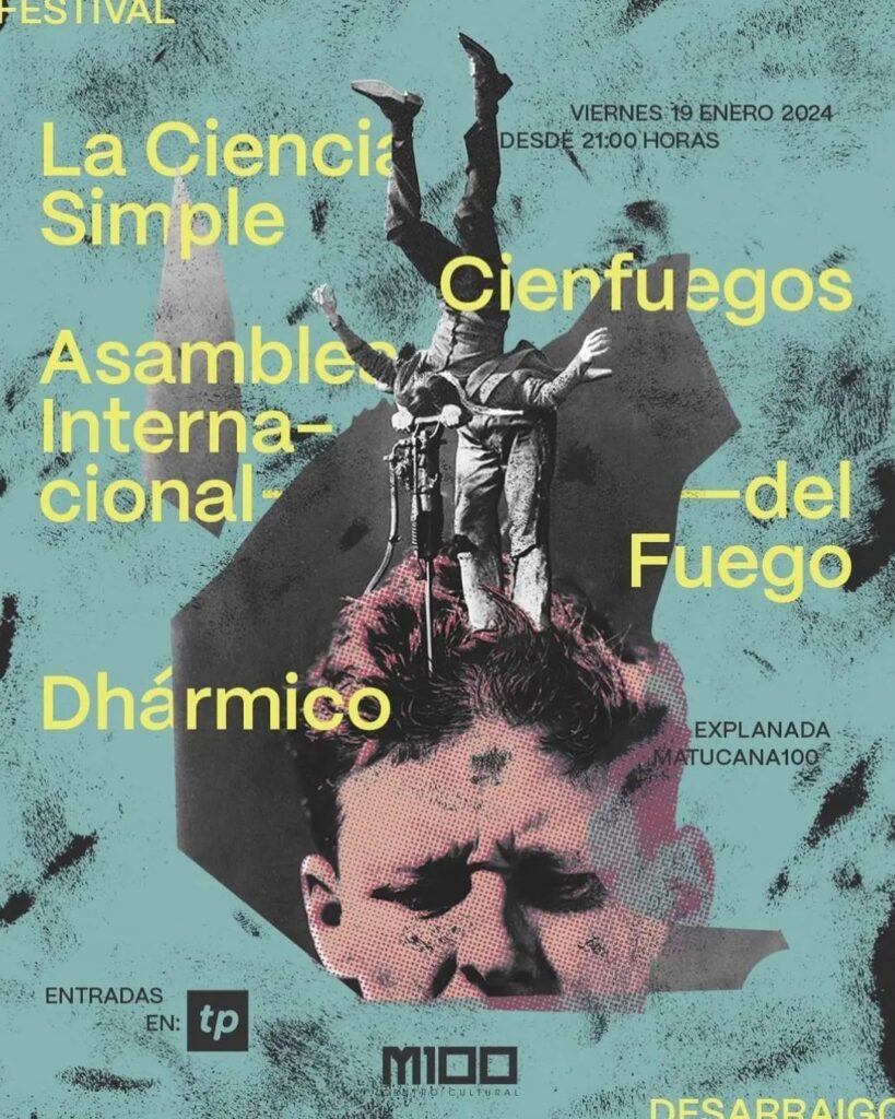 Bajo este contexto, Matucana 100 a pesar de siempre tener una interesante cartelera que abarca una amplia gama de expresiones artísticas de todo tipo, este 19 de enero será testigo de la primera versión del Festival Desarraigo. Un festival que busca a través de la diversidad musical, la exploración y experimentación de distintos sonidos y por supuesto, dar espacio y potenciar la participación y difusión musical de los distintos proyectos. Bajo esta premisa, el cartel de esta edición está compuesto de Asamblea Internacional del Fuego, La Ciencia Simple, Cienfuegos y Dhármico.
