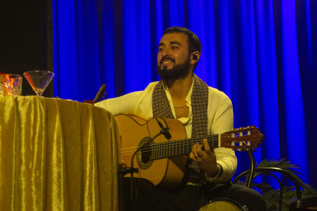 C. Tanagana llenó cada rincón con su presencia, la naturalidad de su interpretación lo hizo sentir como en casa, acompañado de sus músicos y las bellas cantantes que se sentaron junto a él en una gran mesa para interpretar “Me maten”, en lo más alto del escenario, para gozar al ritmo del flamenco regalado a su público chileno quien lo hacía suyo como si desde la cuna hubieran oído al artista. La noche fue perfecta, entre las voces únicas, los bailes, el estilo y el carisma del cantante que sonreía cuando gritaban por más unísonamente.
