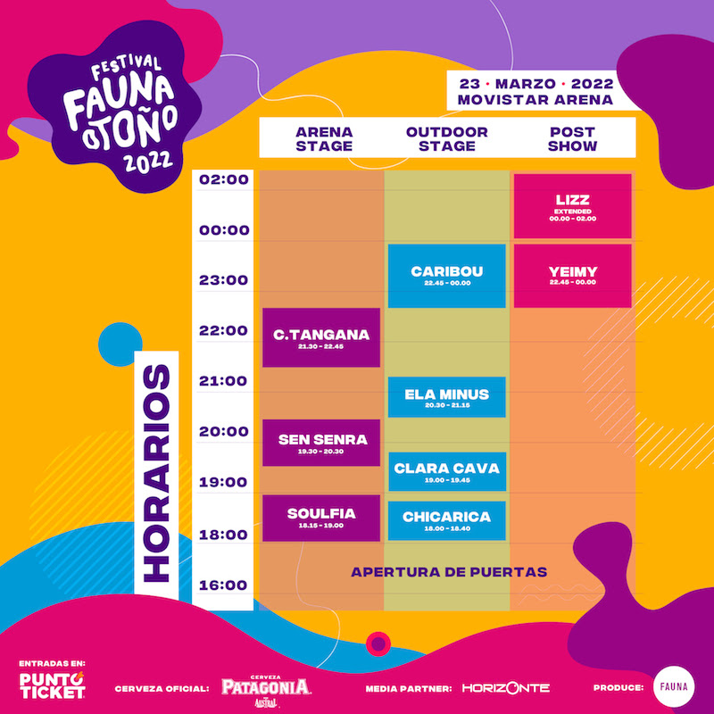 la cantante y músico nacional Soulfia, la colombiana radicada en Nueva York Ela Minus, Clara Cava desde Argentina, los chilenos de Chicarica, Yeimy, que prepara un DJ set especial para la jornada y Lizz, Dj y productora que será la encargada de animar la fiesta post show de Fauna Otoño hasta las 02:00AM.