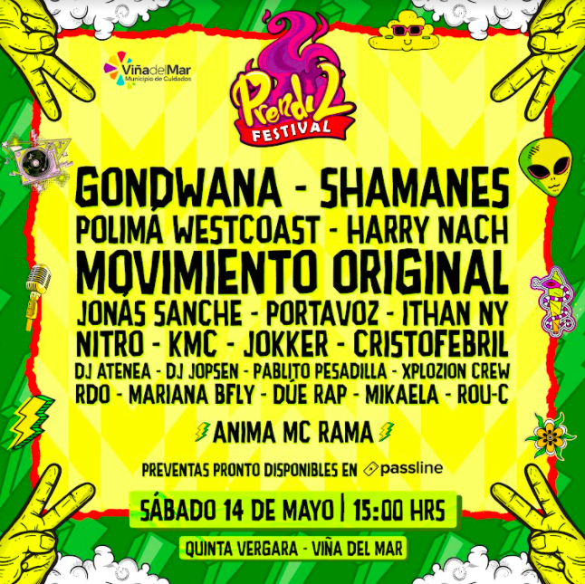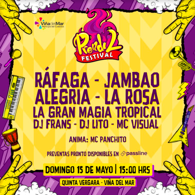 Lunes 11 de abril de 2022.- El Festival Prendi2 ya es todo un éxito. Su versión anterior dedicada a la cumbia, fue uno de los eventos más comentados del verano. Esta vez, regresa en dos ediciones: El 6 de mayo al Espacio Marina de Concepción, mientras que el 14 y 15 de mayo a la Quinta Vergara en la ciudad jardín.