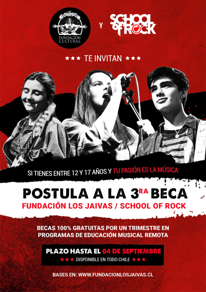 Luego del éxito de convocatoria de sus dos ediciones anteriores, la Fundación Cultural Los Jaivas, junto a la academia internacional de música School of Rock, otorgarán nuevamente una serie de becas para niños y jóvenes músicos del país. Gracias a esta alianza, 16 beneficiados podrán acceder a los programas trimestrales de educación musical impartidos en School of Rock a través de clases remotas.