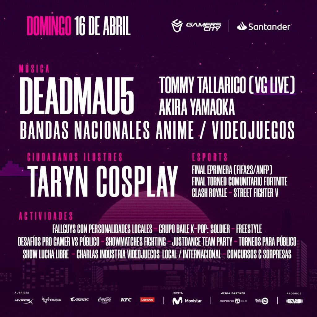 Entre las novedades del Line up, también se encuentra deadmau5, reconocido DJ y productor canadiense quien prenderá al ritmo House la jornada de cierre del domingo 16 de abril. Ese mismo día, se realizará la final de Fortnite y de Clash Royale. Además de la final de ePrimera que coronará al mejor en FIFA23, entre otras novedades de la jornada de cierre. Otra de las novedades del Line Up, es que se integra por los tres días del evento, el famoso cosplayer italiano Taryn, quien es conocido por realizar Cosplay de la más alta calidad interpretando a personajes de videojuegos, animé y manga alrededor del mundo. Estas novedades se suman a las ya anunciadas en la ciudad de los gamers, que incluyen los conciertos de David Wise, Akira Yamaoka, Video Games Live, BABYBEARD, showmatches, lucha libre, K-Pop, electrónica, Freestyle y muchas atracciones que harán de GamersCity Santander el festival de videojuegos nunca antes visto en Chile. La apertura de puertas será a las 15.00 horas en la primera jornada del viernes, mientras que el sábado y domingo será a las 11.00 horas. Puedes revisar los flyers con cada evento de cada día abajo: