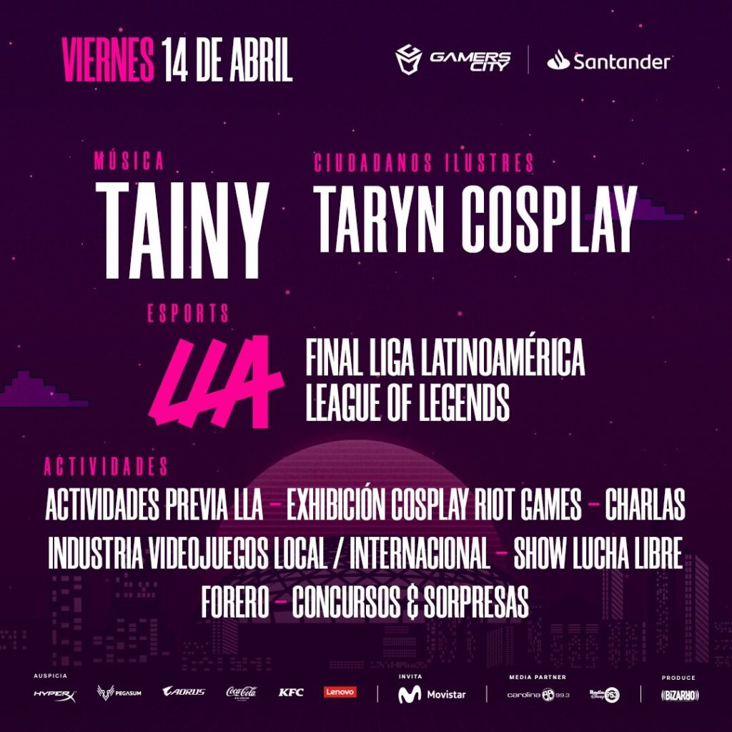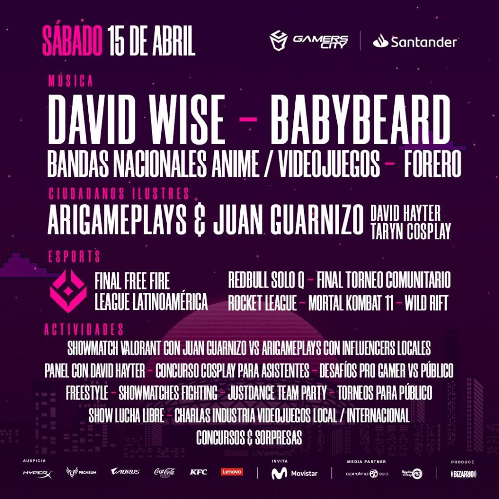 una exhibición de cosplay oficial de Riot Games, entre otras novedades. En tanto, el sábado 15 de abril, los Esports se tomarán el Movistar Arena ya que se realizará por primera vez en nuestro país, la final regional de FreeFire Latinoamérica. Además, de los torneos Rocket League, Wild Rift y Mortal Kombat 11. Junto con esto, los invitados internacionales AriGameplays y Juan Guarnizo se enfrentarán en showmatch de Valorant. Mientras que David Wise y BabyBeard serán los artistas que llenarán de música el evento. El panel estará a cargo de David Hayter.