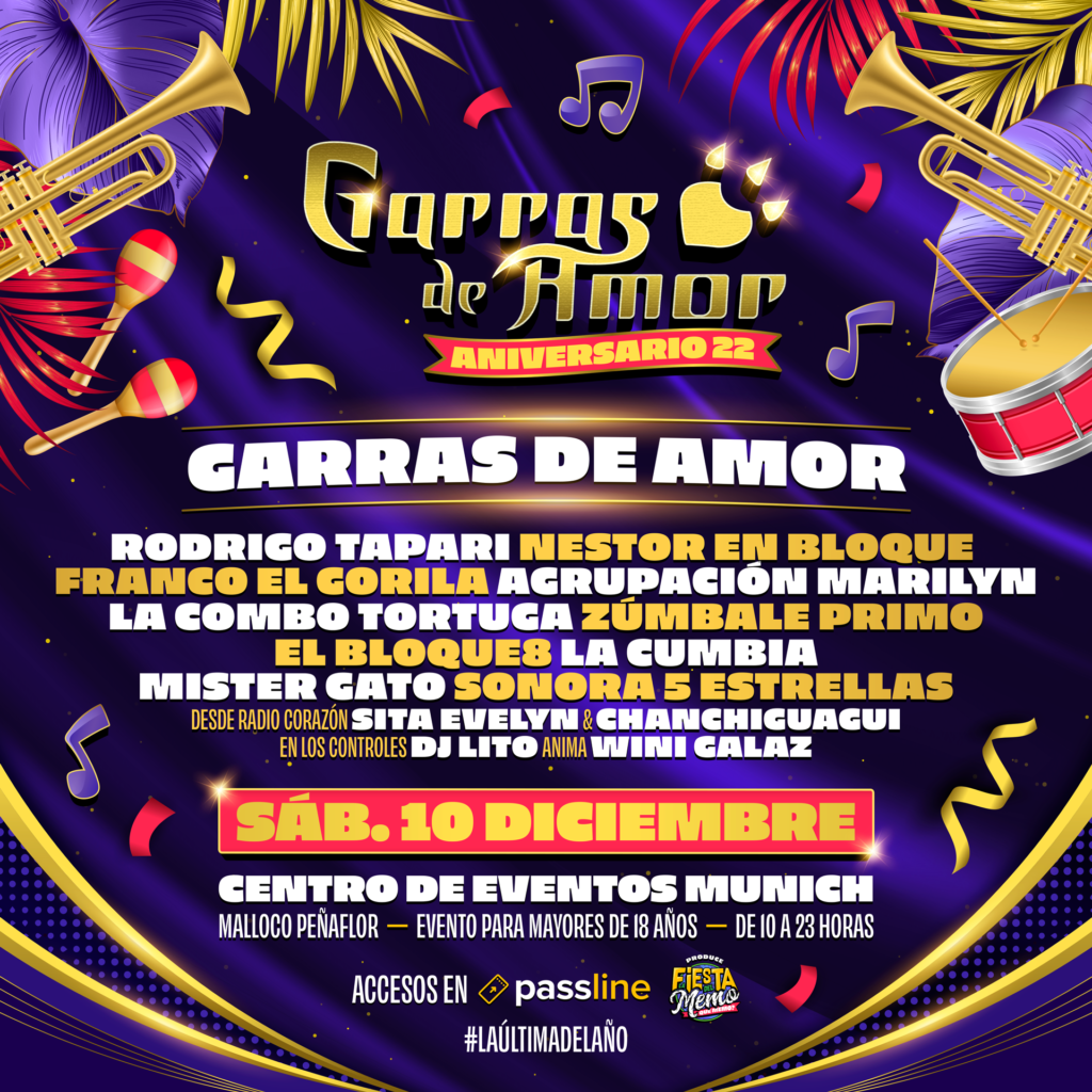 ¡Este será un cumpleaños inolvidable! Garras de Amor, una de las bandas de cumbia más influyentes en la movida nacional, celebrará sus 22 años de carrera con un festival donde se reunirá lo mejor de la música nacional e internacional. El evento tendrá lugar el próximo 10 de diciembre en el Centro de Eventos Munich y trae consigo a Rodrigo Tapari, Nestor en Bloque, Franco el Gorila, Agrupación Marilyn, La Combo Tortuga, Zúmbale Primo, El Bloque 8, La Cumbia, Mister Gato y Sonora 5 Estrellas, entre otros artistas.