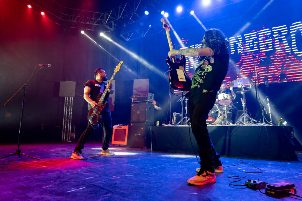 La locomotora patagónica Hielo Negro inició la jornada desplegando un repertorio sólido y eléctrico que fue subiendo en intensidad a medida que los descibeles iban aumentando la potencia de los parlantes y el calor iba inundando el aire. Kaos ahora!, Halcón de soledad, Salamandra y Cabo negro, entre otras, abrieron la ruta sonora del trío, repasando gran parte de su discografía sobre el escenario.