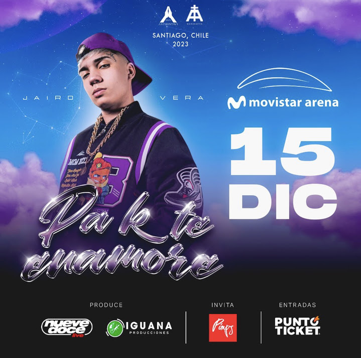 Con casi tres millones de oyentes mensuales, Jairo Vera es el nuevo fenómeno del género urbano en Chile. Para celebrarlo, tras haber agotado un espectacular show en el Teatro Caupolicán en junio, el artista ahora apunta más alto: cantar ante 15 mil personas en el Movistar Arena, en una presentación que contará con invitados de lujo y muchas más sorpresas.