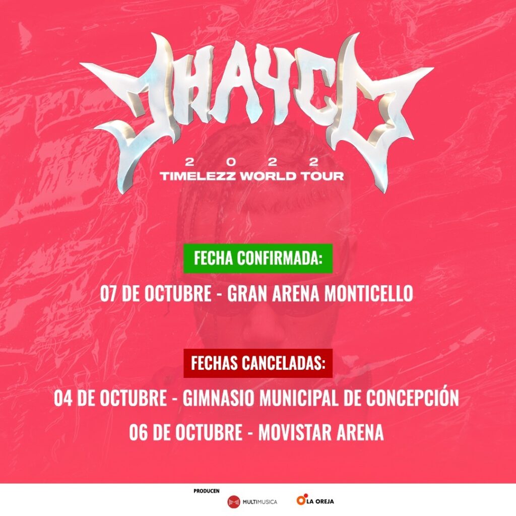 Santiago, Chile, 20 de septiembre 2022. – Lamentamos informar que los shows de Jhay Cortez, programados para el 4 de octubre en el Gimnasio Municipal de Concepción y el 6 de octubre en Movistar Arena, no podrán ser realizados por motivos estrictamente logísticos.