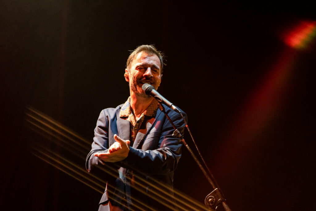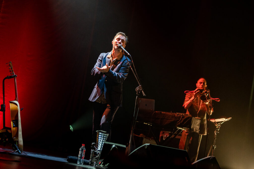 Como un presagio, la noche comienza con la entrañable colaboración realizada junto a Wiranda Johansen, representada por la aparición de una dulce voz que nos compaña con «Perfect day». Posterior a ello, ese vozarrón tan característico envuelve el teatro con lo que sería el inicio de una narrativa de historias y procesos que conducirían la noche, mientras el público con admiración se deja llevar por él con muy baja intervención, como si quisieran mantener la esencialidad del acto ritual. Nuestro narrador lleno de chispa, contextualiza cada canción con personalidad. Con una maliciosa percusión, presenta «16 toneladas» como “el manifiesto comunista yanqui”, preparativos para lo que en sus palabras se convertirá en “el momento obscuro de la noche” que acompaña el lamento con un cálido rojo que envuelve el lugar para corear y acompañar al ritmo de las palmas la icónica «Desde que te perdí» en conjunto a uno de los muchos hologramas que pudimos percibir esta noche, Silvia Pérez Cruz.