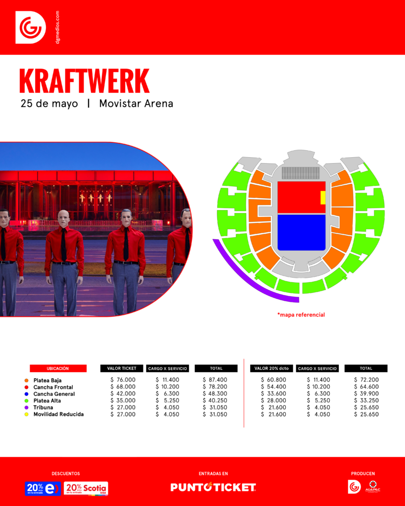 El proyecto multimedia Kraftwerk fundado en 1970 por Ralf Hütter y el fallecido Florian Schneider anuncian su regreso a Chile luego de 7 años de su última presentación. El próximo 25 de mayo disfrutaremos en el Movistar Arena sus composiciones, que utilizan técnicas innovadoras, voces sintéticas y ritmos informatizados.