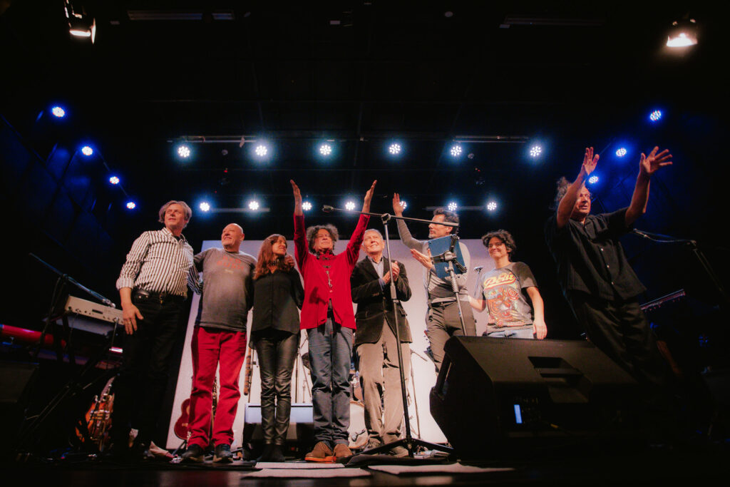La máquina de hacer música hermosa y potente conformada por Jorge Campos, Cuti Aste, Pedro Villagra, Edita Rojas e Ismael Oddó dio un emotivo concierto en el Centro de Arte Alameda a sala llena para hacer un recorrido sonoro por la historia reciente del país, visitando pasajes brillantes de la música popular chilena y uniendo un relato conformado por una constelación de nombre fundamentales para mantener vivo el recuerdo, la sangre y el amor. Una sesión que fue también un abrazo entre el público, sus integrantes y una serie de invitad@s de lujo.