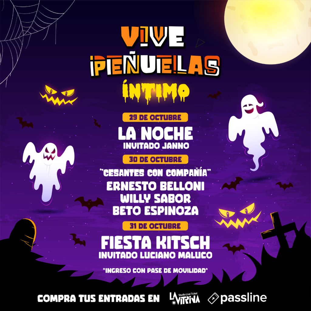 Los mejores panoramas para el próximo fin de semana largo están en Vive Peñuelas Íntimo, ciclo que recibirá a lo más destacado del espectáculo nacional en tres noches inolvidables. En este formato mucho más cercano, se presentará el exitoso grupo La Noche, el viernes 29 de octubre; el sábado 30 será el turno del show de humor Cesantes con Compañía, para concluir el domingo 31 de octubre con la mejor Fiesta Kitsch, para bailar y esperar con todo la noche de Halloween.