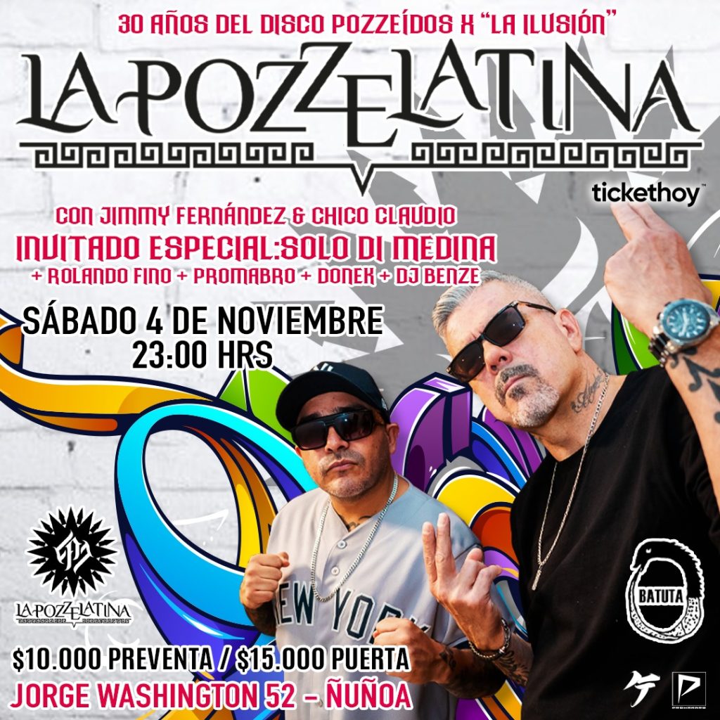 Los pioneros del hip-hop, La Pozze Latina, celebrarán sus 30 años del lanzamiento de su primer disco “Pozzeidos X La Ilusión” (1993) con un show el 04 de noviembre a cargo de su líder y fundador Jimmy Fernández y el MC Chico Claudio. También estarán como artistas invitados Solo Di Medina, Rolando Fino, Promaabro, Donek y DJ Benze. La cita será a las 23.00 hrs en La Batuta