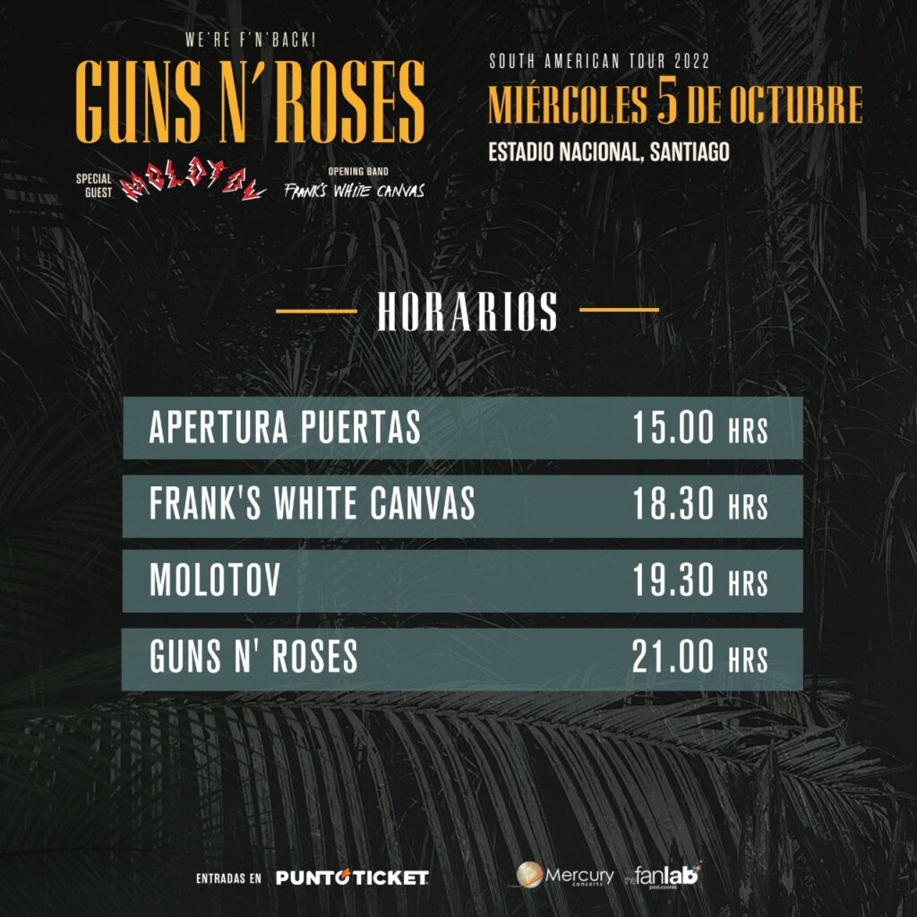 El primer show de la tarde, a cargo de las chilenas Frank’s White Canvas, comenzará a las 18:30 horas, mientras que los mexicanos Molotov subirán al escenario a las 19:30 horas. Guns N´Roses, en tanto, comenzará su concierto a las 21:00 horas.