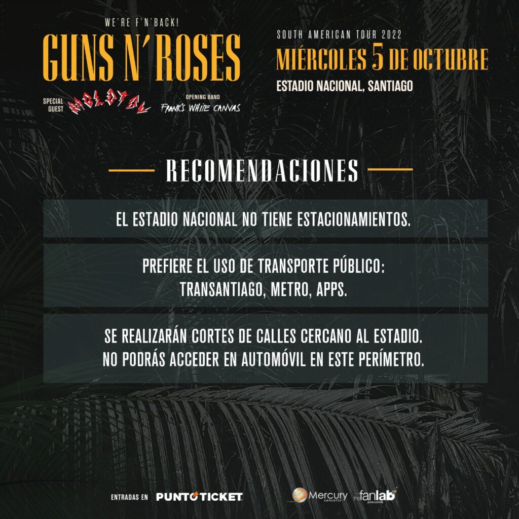 Finalmente, se sugiere a las personas no acudir a las cercanías del Estadio Nacional si no cuenta con un ticket para el concierto de Guns N´Roses, ya que el ingreso al perímetro estará resguardado para mantener el orden y garantizar la seguridad de los asistentes y trabajadores del evento.