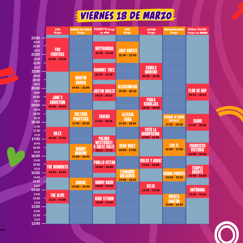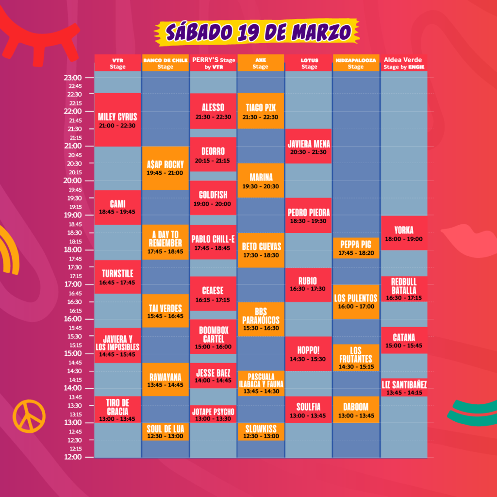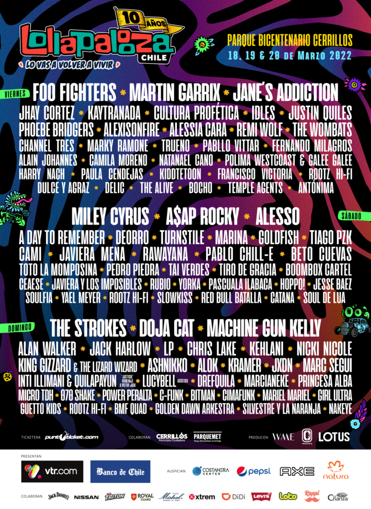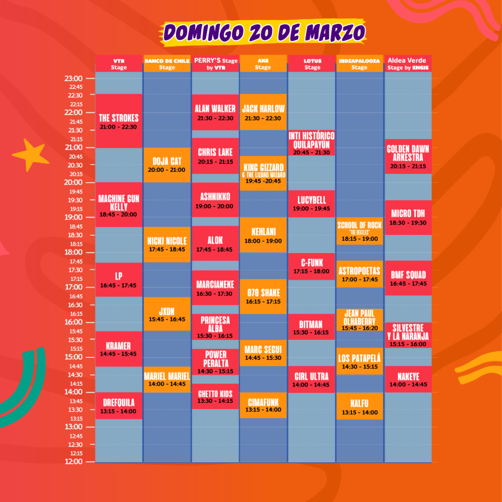 Quedan sólo dos semanas para el evento musical más grande de Chile. Luego de la larga espera para retomar la mejor experiencia en vivo, Lollapalooza Chile da a conocer los horarios de las más de 100 presentaciones de este 18, 19 y 20 de marzo en el Parque Bicentenario de Cerrillos.