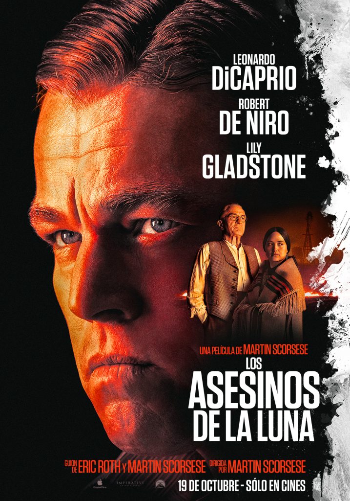 Parte de sinopsis: Cuando se descubre petróleo en la Oklahoma de los años 20, bajo las tierras de la nación Osage, sus pobladores son asesinados uno a uno hasta que el FBI interviene para resolver los crímenes. Basada en una historia real y narrada a través del improbable romance de Ernest Burkhart (Leonardo DiCaprio) y Mollie Kyle (Lily Gladstone), la cinta es una épica saga criminal del oeste, donde el amor verdadero se cruza con la traición inconfesable. También protagonizada por Robert De Niro y Jesse Plemons, «Asesinos de la luna» está dirigida por el ganador del Oscar, Martin Scorsese a partir de un guión de Eric Roth y el propio director, basado en el best-seller de David Grann