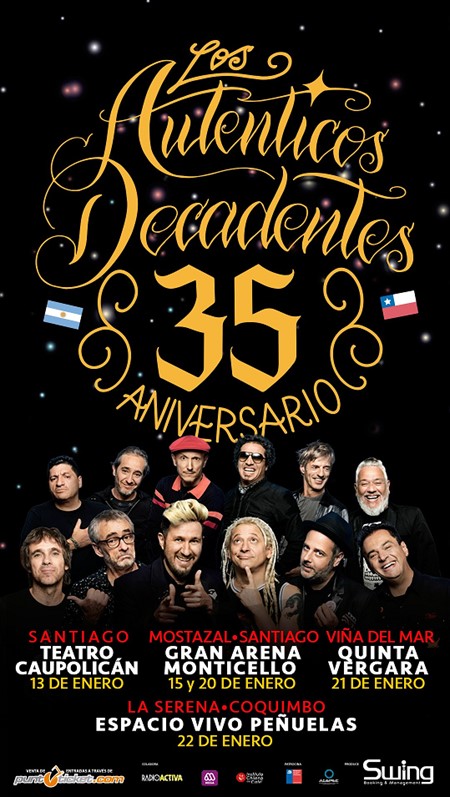 Swing Management anuncia oficialmente la Gira de verano Chile 2022 con la que celebraremos el Aniversario 35 de Los Auténticos Decadentes. Las entradas se encuentran a la venta por Sistema PuntoTicket.