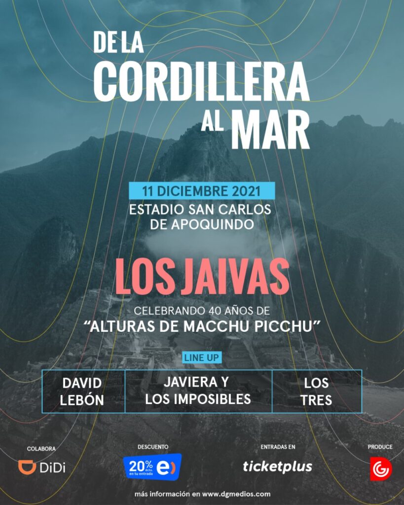 Las entradas para disfrutar en vivo a Los Jaivas celebrando 40 años de Alturas de Macchu Picchu, más David Lebón, Los Tres y Javiera y Los Imposibles estarán disponibles en www.ticketplus.cl desde este viernes 19 de noviembre a las 17.00hrs con un 20% de descuento exclusivo para Clientes Entel.