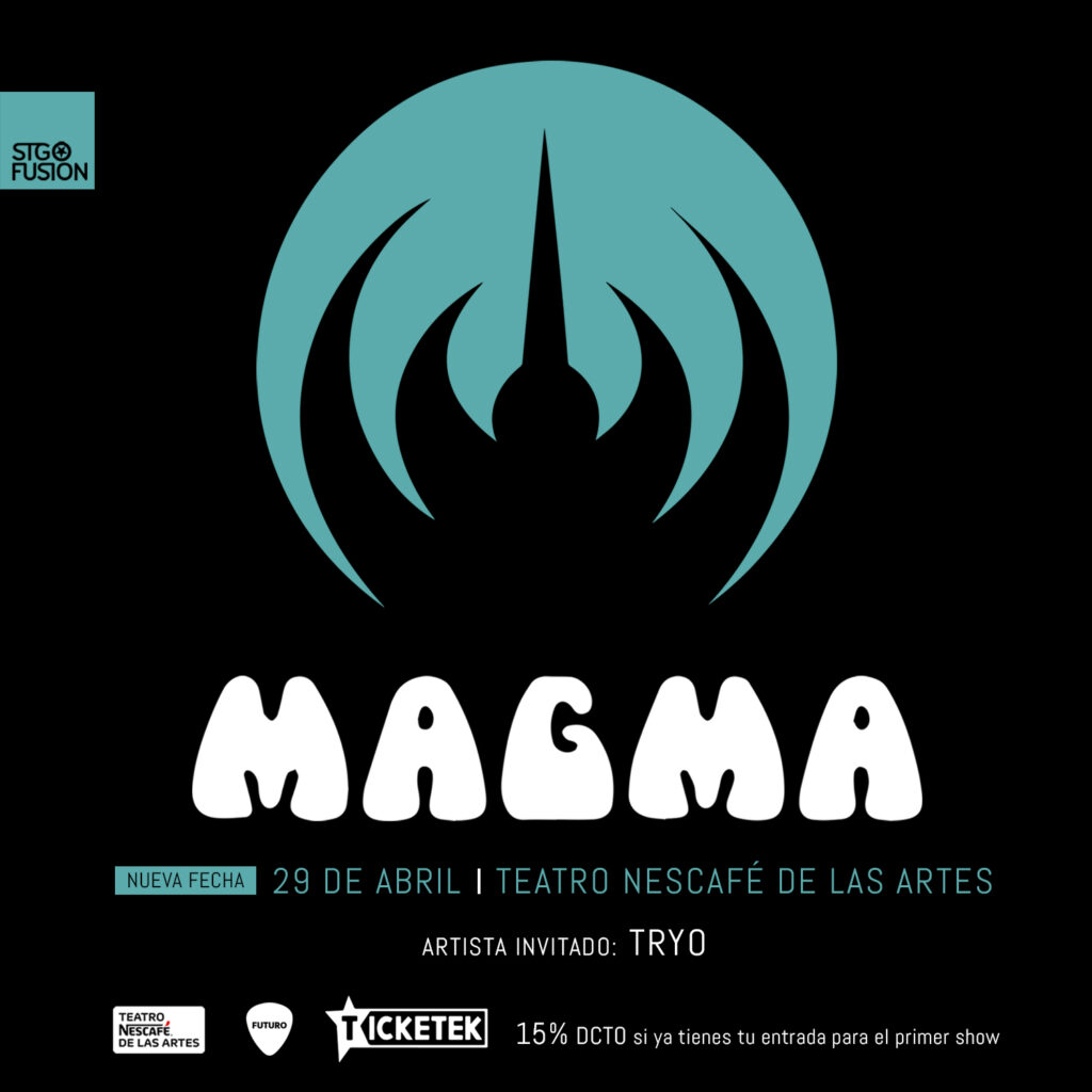 Todo un éxito es el regreso de Magma a Chile, por eso anuncia un tercer concierto en Chile para el 29 de abril, que se suma al casi agotado show del 28 del mismo mes, ambas en el Teatro Nescafé de las Artes, y del 1 de mayo en el Teatro de la Universidad de Concepción. Las entradas para esta nueva presentación ya están a la venta en Ticketek.cl con un 15% de descuento para quienes tengan ticket para el primer show, hasta agotar stock (máximo dos entradas por persona).