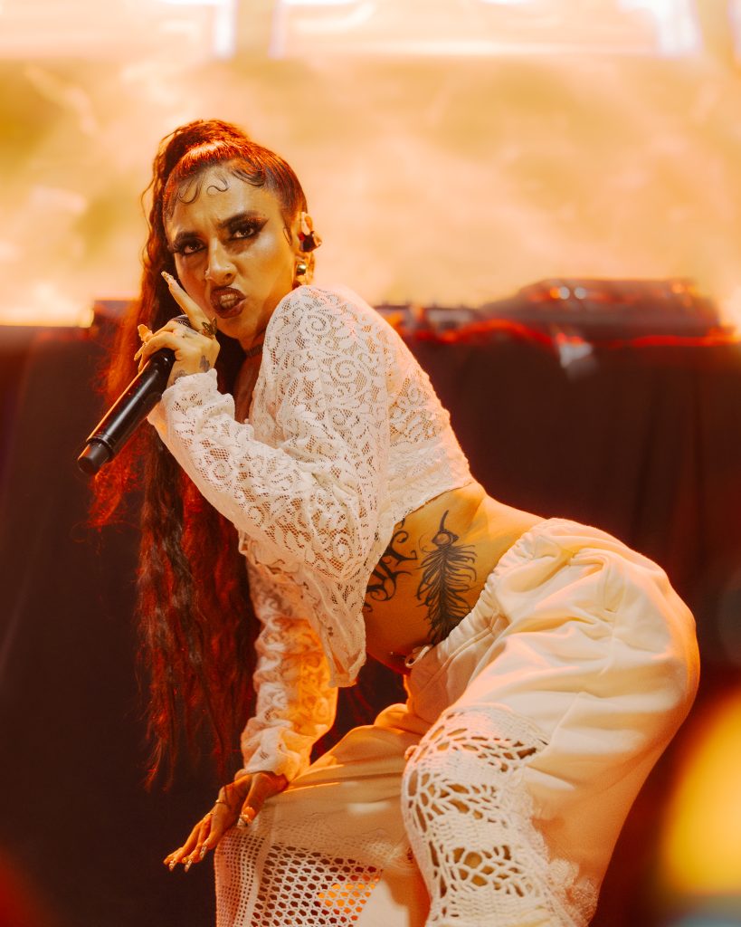 A cargo de abrir los fuegos de esta noche estuvo la chilena Aura Bae, quien con su rap y sonidos gitanos hizo bailar a todos y se llevó la ovación del público. La artista dio en el gusto a todos sus fans y nos regaló sus éxitos más emblemáticos, como «Por la noche», «Nanai», «Contigo» y «Tengo en trato». Su voz potente y su innegable flow nos dejaron sin aliento, además que su perreo sexy combinado con un provocativo vestido añadieron un toque de autenticidad a su show.