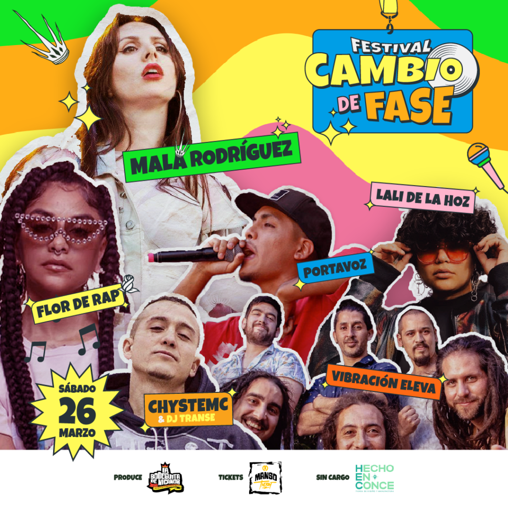 La Bodeguita de Nicanor es un célebre espacio de Concepción, dedicado desde hace una década a la música en vivo, con especial énfasis en el folclor y la cumbia chilena, pero abierto también a las nuevas propuestas y a los diversos estilos musicales cultivados en el país. El espacio se vio duramente afectado – como muchas salas de concierto – durante la pandemia, debiendo cerrar temporalmente. En el marco de su regreso, ha anunciado a la ciudad penquista grandes proyectos y eventos, confirmando que producirá a fin de mes, un potente festival que llevará por nombre «Cambio de Fase«, cuyo cartel será encabezado por la famosa rapera española dos veces ganadora del Grammy Latino Mala Rodríguez, la potente música chilena Flor de Rap, Lali de la Hoz, el destacado rapero chileno Portavoz (de retorno a los escenarios tras sufrir un accidente en el 2021), ChysteMc y la atractiva banda de reggae nacional Vibración Eleva.